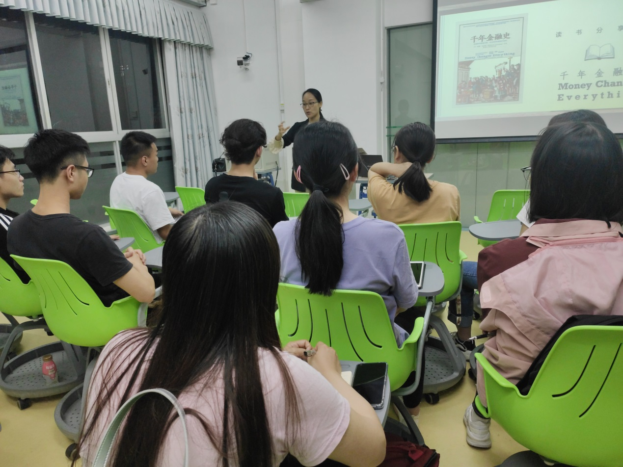杨碧云老师从历史角度简介金融的产生和含义,货币的特性,从金融的本质、金融的功能、为什么金融是文明的最大推手、未来世界面临的挑战(人口老龄化、贫富差距加大)、金融所能起到的作用五个方面导读了《千年金融史》。杨老师以简单易懂的语言分析了金融案例中的货币流动,将国家一带一路政策与我国经济发展的历史联系起来。杨老师希望能通过这次分享会,让同学们了解更多的金融相关知识,提高自己的“财商”。