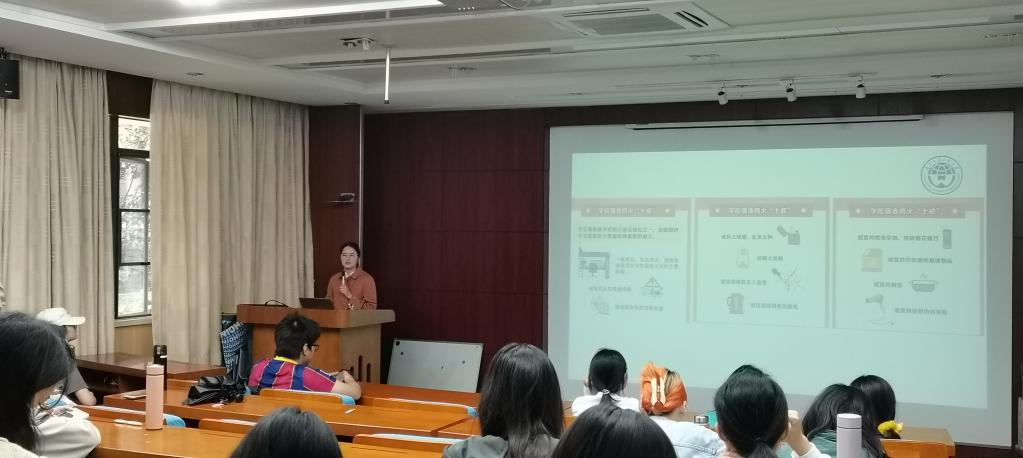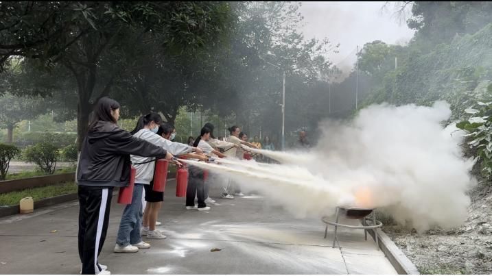 4月27日下午,学工部陈润旭老师在白云山校区六教B108给同学们开展消防安全讲座,着重强调学生楼宇如何排查消防隐患、宿舍防火“十戒”、火灾发生时应自救与互救相结合等。在消防实操演练环节,保卫部杨日光老师为大家讲解消防铨、灭火器和防毒面罩的使用方法及注意事项,之后同学们分批次进行练习使用干粉灭火器。学生社区内常见的干粉灭火器使用的正确详细步骤:提起灭火器,拔掉保险销,握住喷管最前端,对准火焰根部,往下按压阀,对准火焰喷射。