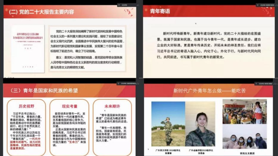 像黎思蕾这样专注于党的二十大精神宣讲的成员还有37名,他们在同学之中进行党的二十大精神宣讲,在广外校园中掀起一股“党的二十大精神学习热潮”。3月初,伟德bv国际体育新时代青年师生理论宣讲团正式面向全校开放预约,宣讲团以研究宣传习近平新时代中国特色社会主义思想为主线,充分发挥青年群体的朋辈示范引领作用,以浅显易懂的语言、新时代青年人喜闻乐见的方式,着力推进党的二十大精神“进校园”“进支部”“进班级”。截至目前,宣讲团面向全校共开展宣讲活动12场,覆盖学生人数2000余人。