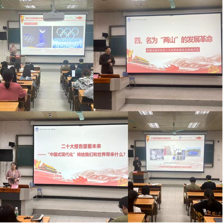 校新时代青年师生理论宣讲团成员马骁、张悦欢、蔡煜琳、李梦迪、陈健红、王华凤、刘雅莉、王枥焓从中国式现代化的起源、过程和结果三个维度,结合中国式现代化五大特征,谈中国式现代化形成于中国共产党人的持续探索过程中,对党的二十大精神进行深刻的阐释解读,鼓励学生们坚定不移听党话、跟党走,怀抱梦想脚踏实地,在全面建设社会主义现代化国家的火热实践中绽放出绚丽的青春之花。