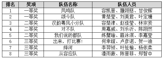 经过激烈的比拼,比赛最终评选出一等奖2组、二等奖3组、三等奖3组。其中,“凤鸣队”凭借出色的表现获得第一名,赢得了参加全国复赛的宝贵机会。