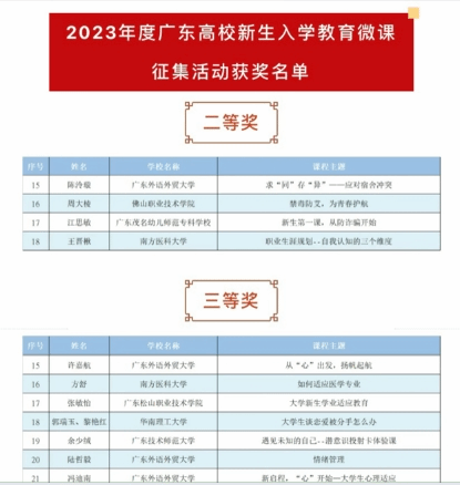 近日,由广东高校网络思想政治工作中心、广东高校易班发展中心公布2023年度广东高校新生入学教育微课征集活动评审结果,伟德bv国际体育4名辅导员老师荣获相关奖项,其中二等奖1人,三等奖3人。
