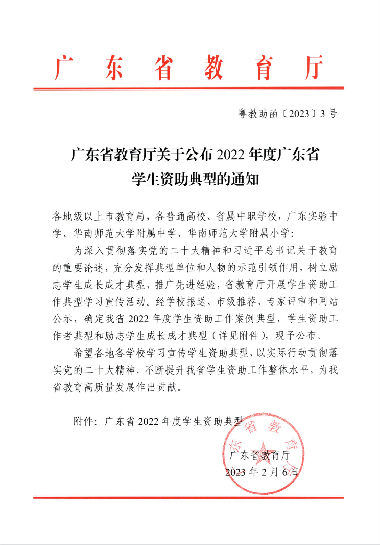 为深入贯彻落实党的二十大精神和习近平总书记伟德bv国际体育教育的重要论述,充分发挥典型单位和人物的示范引领作用,树立励志学生成长典型,推广先进经验,广东省教育厅开展2022年度学生资助典型学习宣传活动,并于2023年2月6日公布最终评选结果。