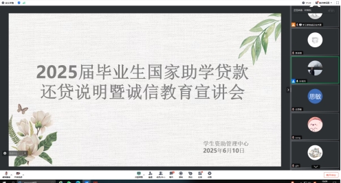 为落实贷款毕业生相关工作,切实提升学生的法治观念与诚信素养,2025年6月10日(星期二)上午,2025届毕业生国家助学贷款还贷说明暨诚信教育宣讲会在线上召开,向贷款毕业生普及还款、征信、还款计划变更、防诈骗等相关知识和注意事项,引导贷款毕业生主动履行国家助学贷款合同。本次会议由官超老师主持,学生工作部学生资助管理中心科长叶祥杰、学生资助管理中心全体老师、各学院济困指导老师、毕业班辅导员以及2025届生源地助学贷款毕业生参加。