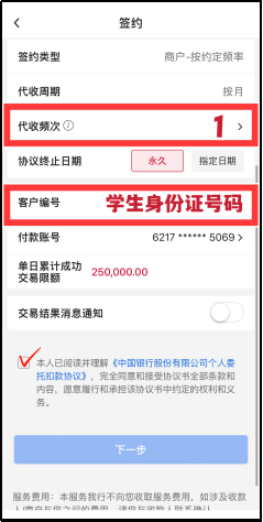 3.填写签约信息:代收频次选择“1”,客户编号录入(学生身份证号码),勾选协议,进入协议阅读后,点击“我已阅读并确认”。