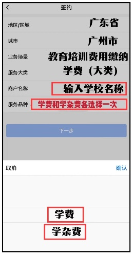 2.进入签约界面:地区/区域选择“广东省”,城市选择“广州市”,业务场景选择“教育培训费用缴纳”,服务大类选择“学费”,商户名称输入(对应学校名称),服务品种选择“学费”签约;签约成功后,再按此流程选择“学杂费”签约。
