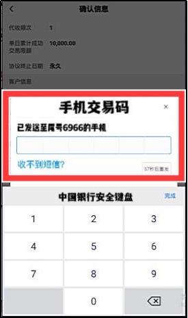 4.进入确认信息页:核对无误后点击“确认”,输入手机交易码(银行短信验证码),签约成功。