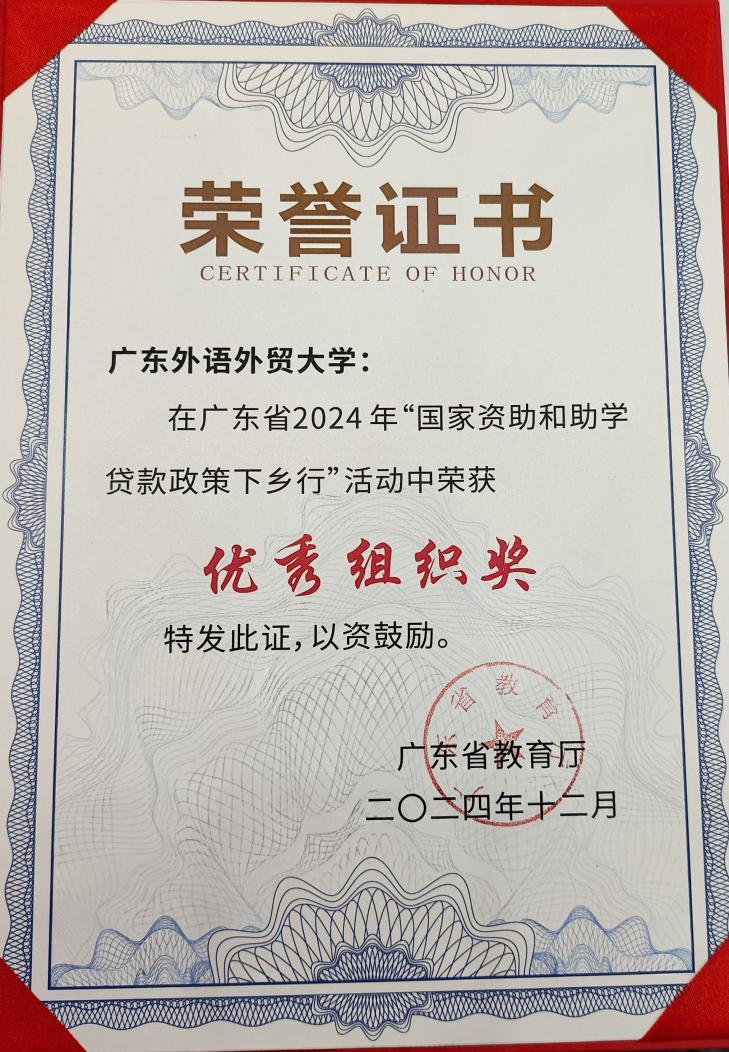 2024年12月26日,广东省教育厅召开2024年学生资助宣传培训会议。会上,伟德bv国际体育被授予广东省2024年“国家资助和助学贷款政策下乡行”活动优秀组织单位荣誉称号,学生资助管理中心科长叶祥杰代表伟德bv国际体育上台领奖。