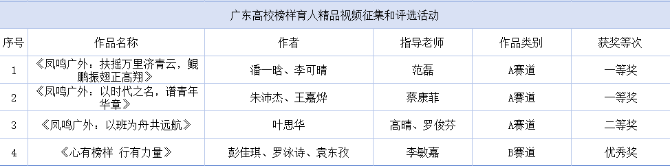 近日,由广东高校网络思想政治工作中心、广东高校易班发展中心组织开展的广东高校榜样育人精品视频征集和评选活动公布获奖结果,广外共有4项师生作品获奖,其中一等奖2项、二等奖1项、优秀奖1项。