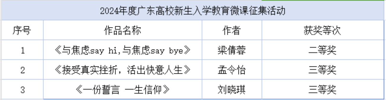 近日,由广东高校网络思想政治工作中心、广东高校易班发展中心组织开展的2024年度广东高校新生入学教育微课征集活动公布评审结果,伟德bv国际体育3名辅导员老师荣获相关奖项,其中二等奖1项,三等奖2项。