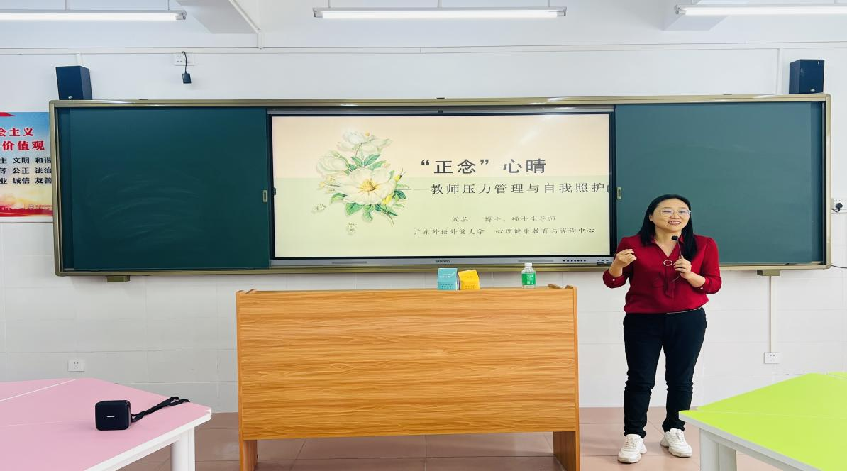 广东外语外贸大学学生工作部心理咨询中心副主任阎茹为乳源县中小学心理专项教师开展专题培训。培训以“教师压力管理和自我关怀”为主题,系统介绍正念减压的理论与实践技能,通过理论讲解、实操演练和案例分享等多种形式,帮助老师们在舒缓自身情绪压力的同时,提高对学生心理问题的觉察能力与深入理解,切实提升学生心理健康教育工作。