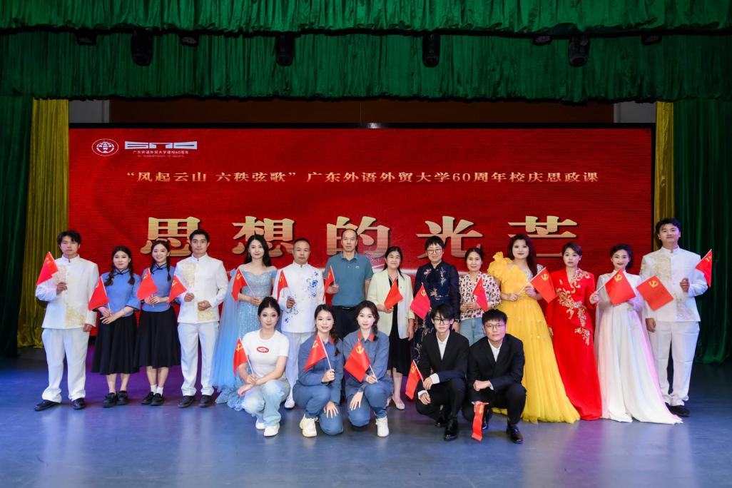 2025年7月1日晚,“思想的光芒”主题音乐党课暨“风起云山 六秩弦歌”广东外语外贸大学60周年校庆思政课在白云山校区六教报告厅顺利举办,此次活动由广东外语外贸大学学生工作部主办,广东外语外贸大学“润心”艺术工作室、“易路相伴”网络文化工作室承办。此次音乐党课将音视频、歌曲演唱、诗歌朗诵等艺术呈现形式相融合,集理论学习、音乐鉴赏、沉浸体验于一体,为现场师生带来一场思想和艺术的盛宴。广东外语外贸大学党委常委、组织部部长黄秀娟,学生工作部部长国佳,学生就业创业中心主任康为茂,学校相关单位的党员干部、教师和离退休教师党员代表、全体辅导员、学生党员和入党积极分子代表、青马班和云山先锋班成员、新时代青年师生理论宣讲团成员等400余人参与活动。