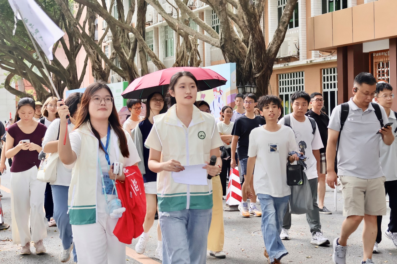 讲解团成员带领新生和家长参观校园