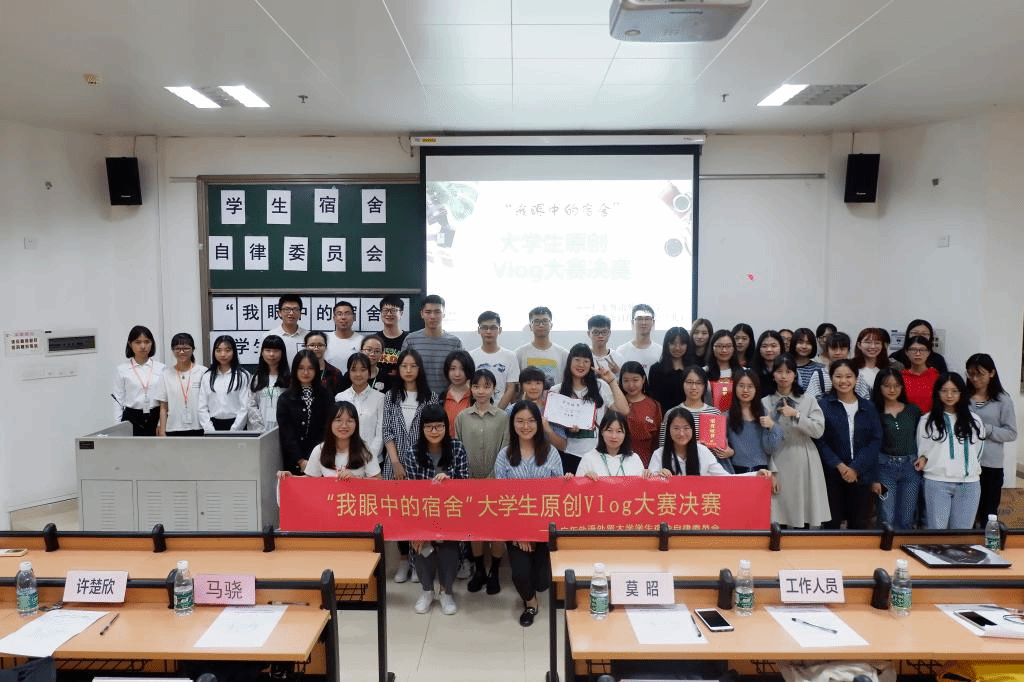 5月9日晚7点,首届大学生原创Vlog大赛“我眼中的宿舍”决赛在北校区第7教学楼213室举行。学生处邹宇,英文学院辅导员马骁,高翻学院辅导员刘亮,日语亚非学院辅导员许楚欣作为评委嘉宾出席本次比赛。