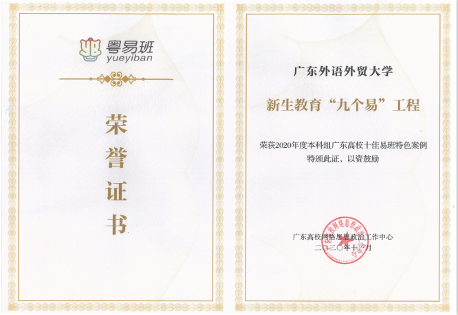 ●8月3日至9月6日,“广外易班”开展新生教育“九个易”工程,教学活跃度为90229,在全国856所高校中排名第5,荣获“2020年度广东高校十佳易班特色案例”。