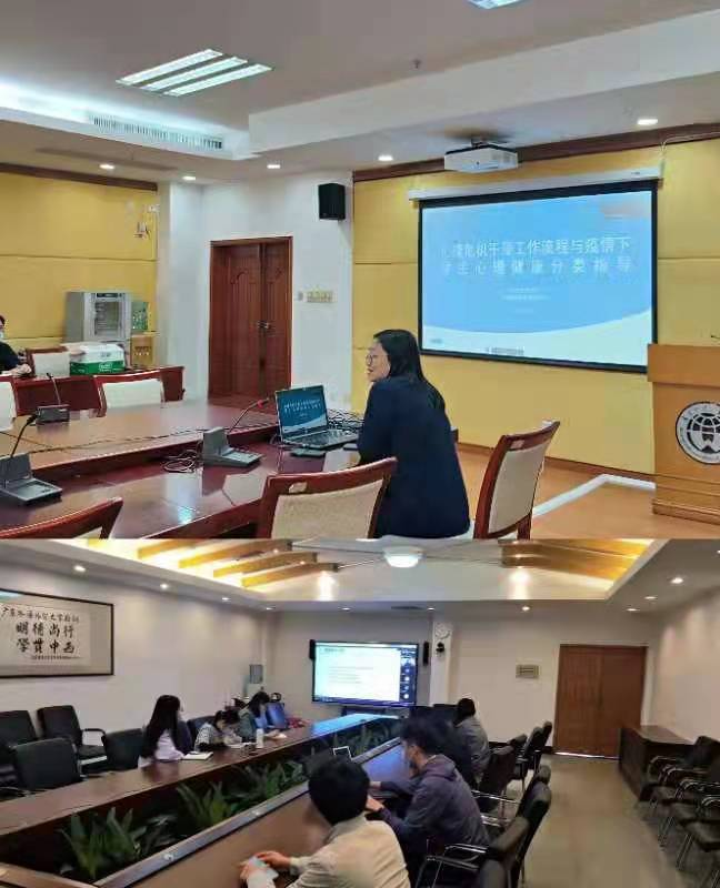 会上,阎茹老师对广东外语外贸大学心理危机预防与干预工作方案、疫情封闭封控期间心理疏导、危机干预紧急处置工作方案、新冠肺炎疫情学生心理健康教育分类指引等方面进行了系统且详细的解读。