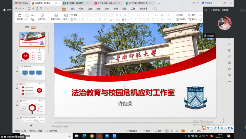 接着,许老师就个人工作室建设现身说法,为大家进行“法制教育与校园危机应对工作室”建设经验的分享。会上,许老师从他本人工作室的建设理念、工作方法、育人成效和团队建设四个角度展开讲解。他讲到,辅导员工作室建设对于提升辅导员队伍的专业水平具有重要意义,其主要目标是创新工作方式和形成可推广的经验。同时,许老师还强调了工作室成员间的合作对工作室成果提升的重要性,鼓励大家共同探讨如何更好地理解和运用辅导员工作室的功能。