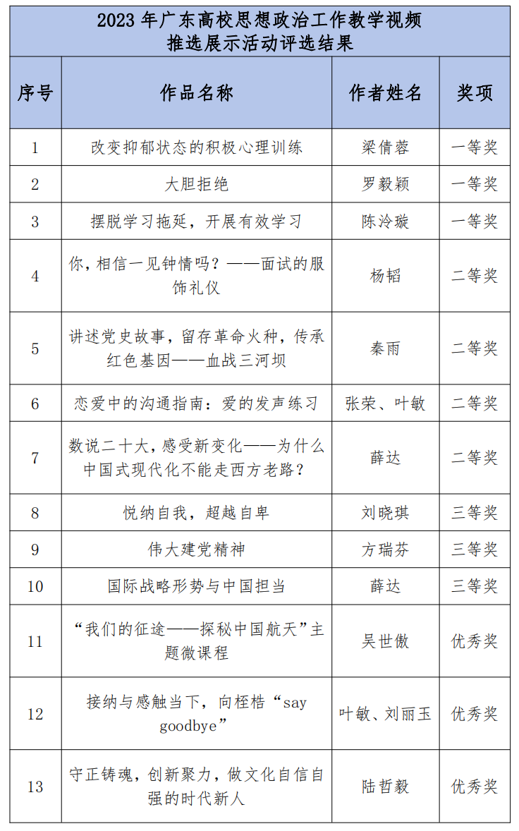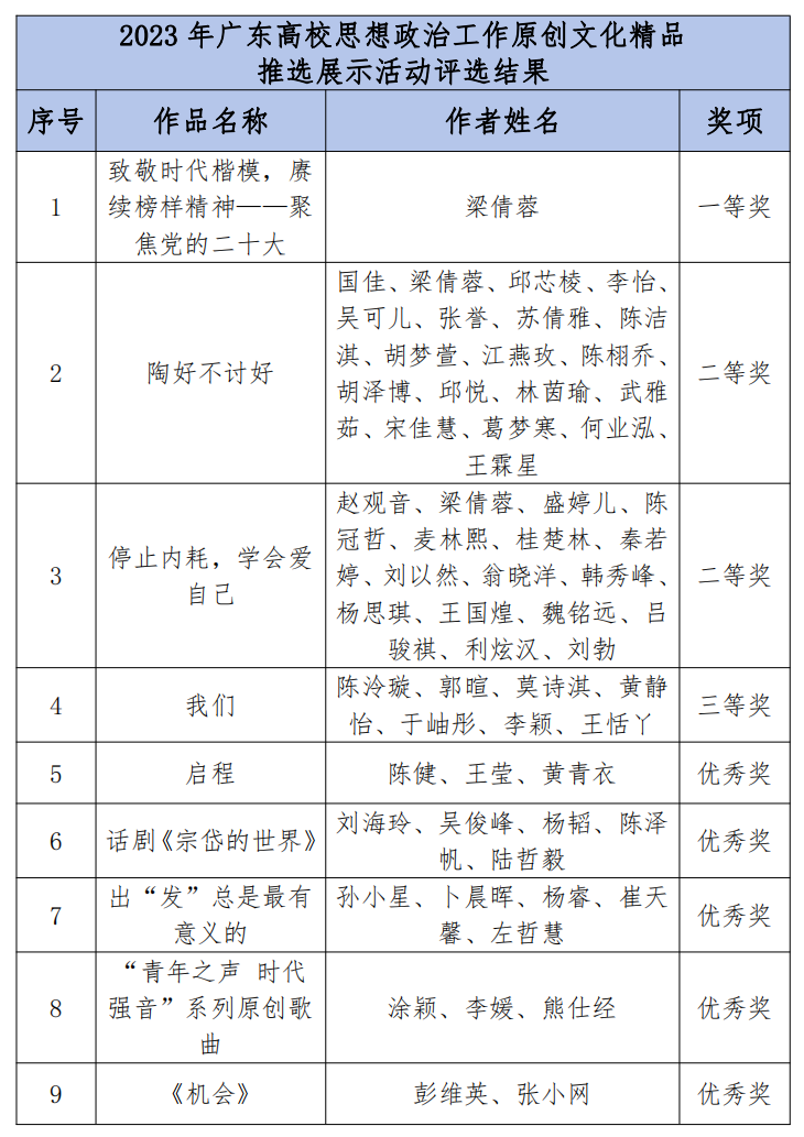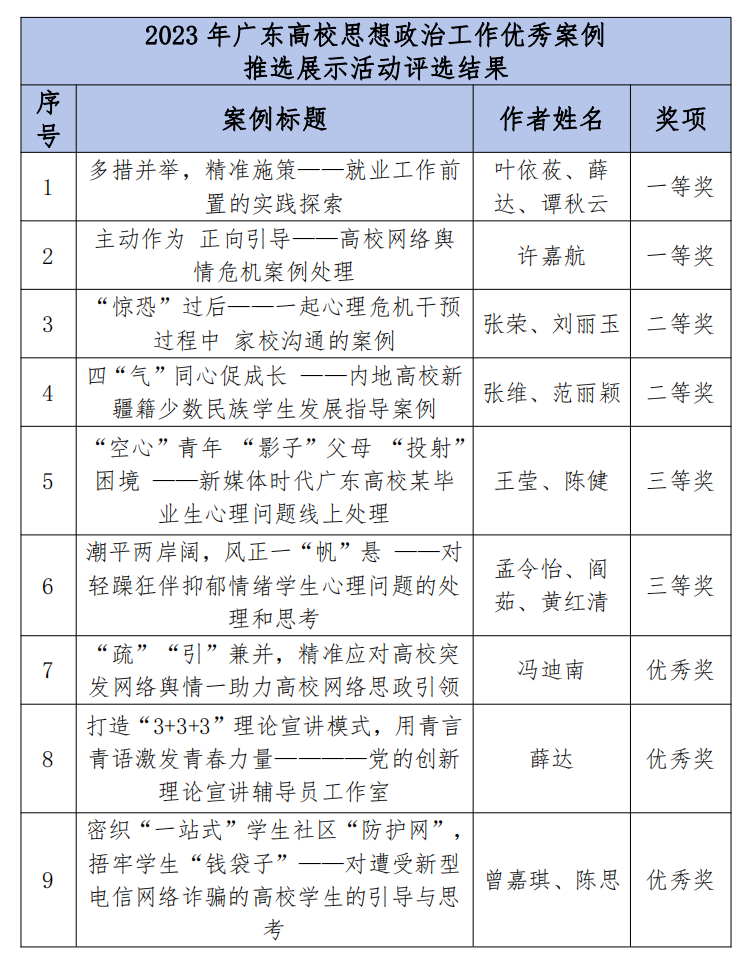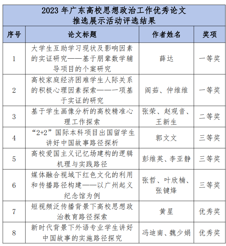为落实党的二十大精神,推进高校思想政治工作队伍建设,高校思想政治工作队伍培训研修中心(华南师范大学)组织开展了2023年广东高校思想政治工作优秀论文、优秀案例、教学视频、原创文化精品推选展示活动。