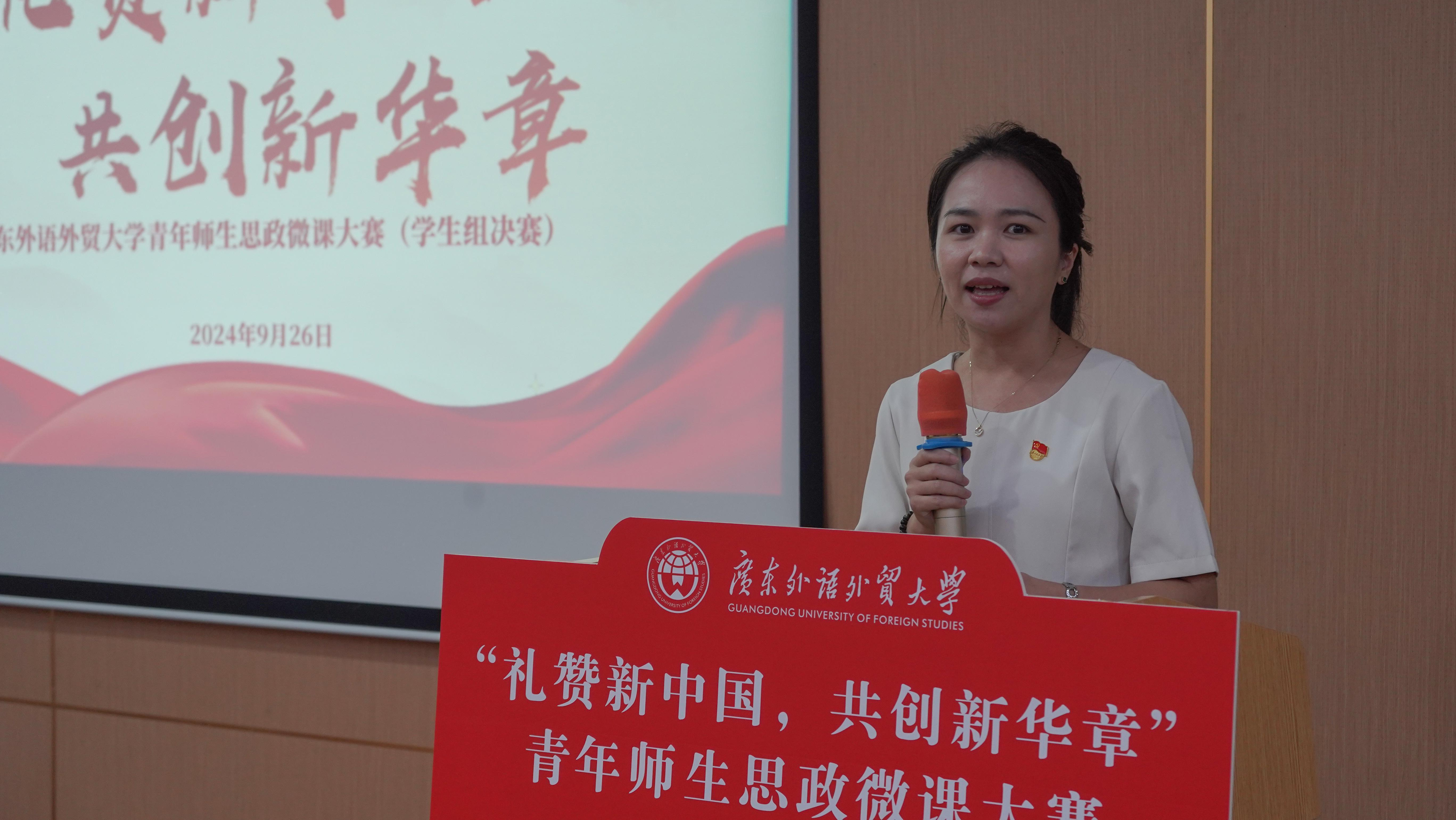 大赛开场前,国佳作开幕致辞,她表示,习近平总书记在全国教育大会上指出建设教育强国,应当具有强大的思政引领力、人才竞争力、科技支撑力、民生保障力、社会协同力、国际影响力。广外一直有忠诚服务国家的使命担当,涌现出无数服务祖国、服务社会的优秀学习典型。她希望通过本次思政微课大赛,一起讲爱国情、强国志、报国行,师生一起共聚力量,将个人成长与发展投身到祖国建设中去。
