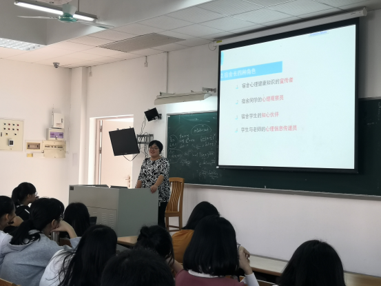 尚丹首先以“识别和预防大学生常见心理健康问题”为题进行心理健康培训。她在明确宿舍长的工作与职责的同时,重点讲解如何利用沟通技巧化解宿舍矛盾。此外,尚丹介绍了当前大学生常见的心理问题,并指导宿舍长们如何预防心理危机的发生,特别是要学会利用学校心理咨询中心资源。