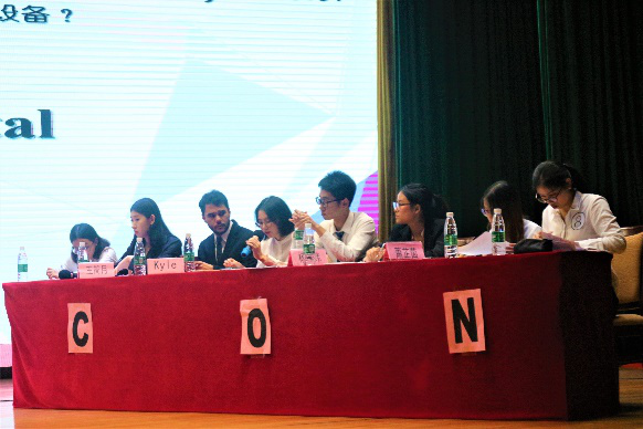 比赛在正反方一辩针锋相对的开场陈词中拉开序幕。正方一辩James认为学生上课注意力不集中的根源是老师的教学质量不高,而并非沉迷电子设备,合理使用电子设备能够丰富教学内容。而反方一辩王简月则认为,学生使用个人电子设备是他们注意力不集中的根源,禁止使用电子设备能够提高学生专注度,便于课堂管理,培养学生独立思考能力,形成良性循环。攻辩环节,正反方二辩就大学使用电子设备对学生未来进入社会的影响激烈争锋。正方二辩湛睿哲认为大学生经过适当教育就能够合理使用电子设备,并举了医生忙于“偷菜”导致婴儿不治身亡的例子,说明大学教育学生合理使用电子设备的重要性,二号译员李锦滢沉着冷静,准确翻译出“偷菜”这个网络词语。正方三辩Robert将电子设备上升到科技的高度,指出当今社会科技对教育的促进作用是不容忽视的,而反方三辩杨家玮则坚持认为电子设备更适于在课外使用,课堂上只会限制学生的独立思考能力。七号译员柳生幸一紧跟辩手的思路,几乎无停顿地中译英,沉着冷静,气场全开。正反方四辩继续深入探讨之前提出的问题,正方四辩李晓蕊提问尖锐,回答逻辑严密,并指出本次辩论关键,令在场观众拍案叫绝。正方二辩和反方三辩以自身为例,你来我往。正方二辩认为需要让学生自己认识到错误,而不只是简单地禁止使用电子产品,正方一辩追加观点“错的不是工具,而是坏人”。而反方三辩则坚持禁止电子产品使用可以有效提高学习效率,反方批评正方缺乏数据支持,过于理想化。比赛进入白热化阶段,双方辩手语速明显加快,这也给译员的翻译增加了难度,但是译员们都表现出了极强的抗压能力,紧跟辩手们的思路,沉着应对“不入虎穴,焉得虎子”“你的良心难道不会痛吗”等高难度语句,展现出了作为译员应当有的素养,赢得了在场观众的阵阵掌声。总结陈词环节,反方四辩指出当代大学生应当减少对电子设备的依赖,培养独立思考能力,提高学习的效率。而正方四辩认为电子设备并不是导致学生在课堂上注意力分散的根源,禁止使用电子设备是没有效果的。