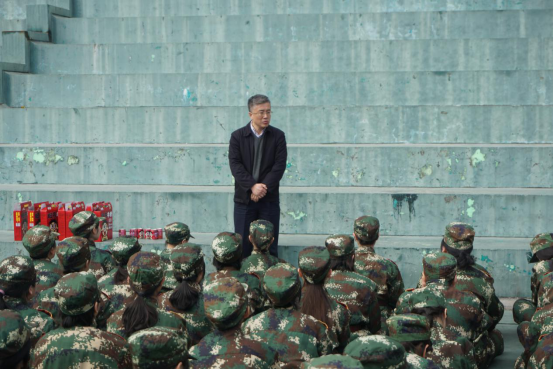 首先,李和民书记代表翻译学院做了慰问讲话。李书记说到,军训的意义在于提高同学们的军事素养、增强大家的意志力以及培养学生爱党、爱国的民族精神。基于军训的意义,李和民书记对同学们提出了三个“好”的期望——把课程学习好、把身体锻炼好和把意志磨练好。最后,书记代表学院提前为同学们送上了美好的新年祝福。