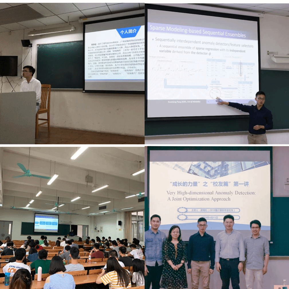 4月11日下午,“校友篇”第一讲邀请信息学院2006级计算机本科、2010级硕士校友庞观松为同学们带来题为“Very High-dimensional Anomaly Detection: A Joint Optimization Approach“的讲座。庞观松现任阿德莱德大学澳大利亚机器学习研究院博士后研究员,在国际重要会议和期刊发表多篇学术论文,并担任多个国际著名会议、期刊的审稿人。他结合自己最近的研究成果,介绍了计算机和数据挖掘领域最前沿的研究方向和解决方案,并特别结合自己在广外七年的生活,与同学们分享了学习体会和成长的收获,现场气氛生动热烈。