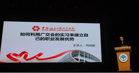 为了让同学们更深入了解广交会,广交会代表、中国对外贸易中心人事处培训发展事务科副科长司徒毅详细介绍了广交会的发展历史及变化、展区的分类和广交会期间的一些相关活动。除此之外,司徒毅还开展了主题为“如何利用广交会来建立自己的职业发展优势”的专题讲座,他认为,作为一名优秀的大学生,我们应当用战略眼光进行职业规划,并锻炼自己的工作能力、意志力和沟通协调能力。