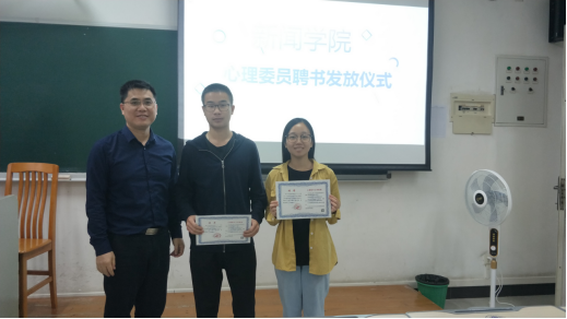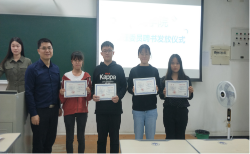 接着,唐老师对于心理委员日常工作的规范作出了一些建设性要求,要求心理委员及心理骨干积极履行职责,为同学们服务。最后,三位老师共同为两位心理骨干及四位心理委员进行了职位受聘仪式,同学们热烈鼓掌表示庆祝。