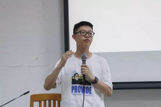 接下来是团委副书记李嘉乐的发言。他首先总结了前两位校友精彩的分享。然后结合团学的两句口号“遇见独特的你,成就最好的我们”和“选择有很多,归属只有一个”提出了归属感一词,他认为在一年的相处中,我们对部门或多或少都会产生一种归属感,而这种归属感也是情怀的体现,他希望团学能将这种情怀永远传承下去。