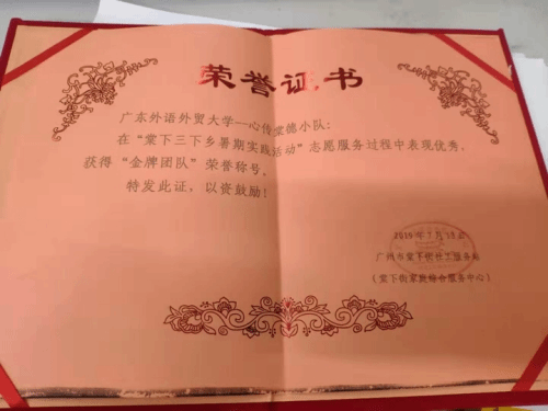 “心(新)传棠德服务队”的队员们团结友爱、合作高效,为棠下社区的良好建设发挥了作用,获得了社区服务站颁发的“金牌团队”的荣誉称号。
