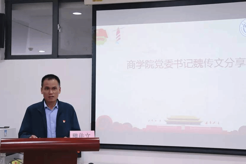 紧接着,魏传文结合学校党委和学院党委要求以及个人学习感悟对于如何认识学党史的深刻意义进行了分享。他带领同学们回顾了习近平总书记在党史学习教育动员大会上的重要讲话,并强调了三个方面的内容:一是党的历史就是一部不断推进马克思主义中国化的历史,就是一部不断推进理论创新、进行理论创造的历史;二是不断总结经验、提高本领,不断提高应对风险、迎接挑战、化险为夷的能力水平是党一步步走过来的重要原因;三是党的历史就是一部践行党的初心使命的历史,是一部党与人民心连心、同呼吸、共命运的历史。魏传文表示,我们要认真领会习近平总书记的重要讲话精神,这对开展党史学习教育具有重大的指导意义。同时,魏传文分享了自己学习党史的心得体会,他认为开展党史学习教育,一是牢记初心使命、推进中华民族伟大复兴历史伟业的必然要求;二是坚定信仰信念、在新时代坚持和发展中国特色社会主义的必然要求;三是推进党的自我革命、永葆党的生机活力的必然要求。最后,他谈到,学习党史就要学习党在历史发展中形成的一系列伟大精神的丰富内涵和时代价值,希望同学们能做到习近平总书记所说的学史明理、学史增信、学史崇德和学史力行。