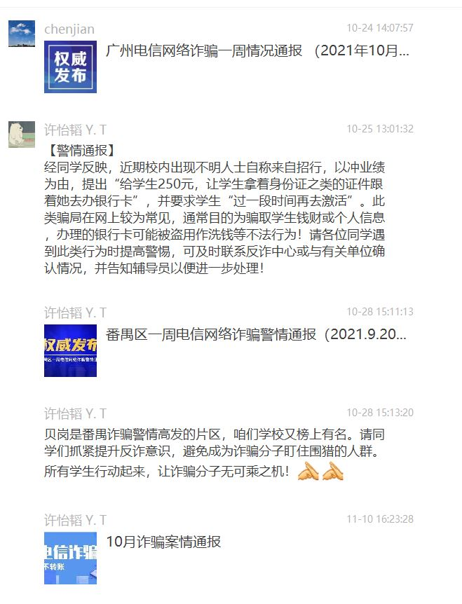 副书记陈健和辅导员许怡韬在反诈群中通报诈骗警情提醒同学们