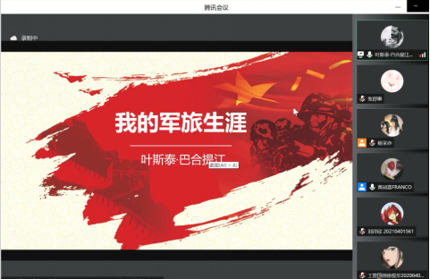 叶斯泰·巴合提江向同学们分享了他的军旅生涯,从“入伍前”“投身军营”“退伍后”三个阶段讲述了自己的参军入伍的经历和心得体会。他表示,军队是一所大学校,在部队的生活让他明白了今天所有的美好都来之不易,参军入伍锻炼了他的意志力和团队意识。同时,他号召同学们积极加入到祖国的国防建设当中,为保卫祖国和人民安全贡献力量,为祖国的国防事业增添一份广外力量。
