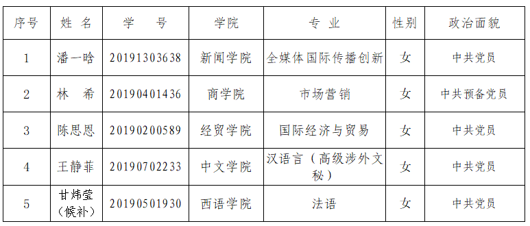 根据学校《伟德bv国际体育做好2023年推荐优秀应届本科毕业生免试攻读硕士学位研究生工作的通知》要求,以及《广东外语外贸大学推荐优秀应届本科毕业生免试攻读硕士学位研究生实施办法(2021年7月修订)》(广外校〔2021〕23号)和《广东外语外贸大学实施推荐免试攻读“4+1+2(3)”模式硕士研究生方案》(广外校〔2017〕28号)》文件精神,经学生个人报名,学院推荐,学生处资格审查,“4+1+2(3)”模式硕士研究生推免遴选工作领导小组组织笔试和面试,最终确定潘一晗、林希、陈思恩、王静菲等4人为推荐免试攻读“4+1+2(3)”模式硕士研究生项目候选人,甘炜莹为候补人选。现公示如下: